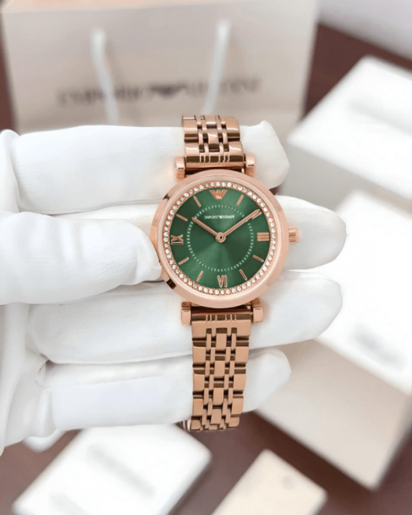 Emporio Armani - For Her - 7AA Premium Collection - Slim Collection - Dial Size 32mm - Features follows - Working 2 Hand Face - 12 Hour Analog - Round Shape Case - Green Elegant Diamond face - Armani Dedicated Logo - Rose Gold Stainless Steel bracelet - Original Steel Clasp Lock - 100% Quality & Reliable high quality battery operated machinery - FREE Emporio Armani Brand Name box - 1 Year Machine Warranty - SMA-FS849-985314