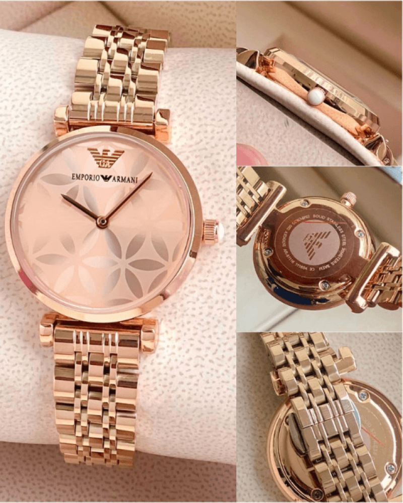 Emporio Armani - For Her - 7AA Premium Collection - Slim Collection - Dial Size 32mm - Working 2 Hand Face - 12 Hour Analog - Round Shape Case - Elegant Floral rose gold Elegant Dial - Decent Looks - Armani Dedicated Logo - Rose Gold Stainless Steel bracelet - Original Steel Clasp Lock - Guaranteed high quality battery operated chronograph machinery - SMA-FS849-985341