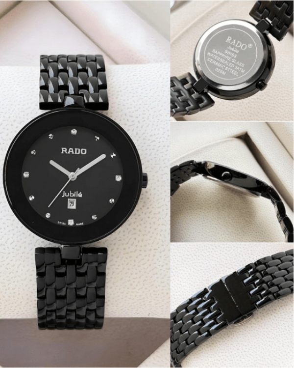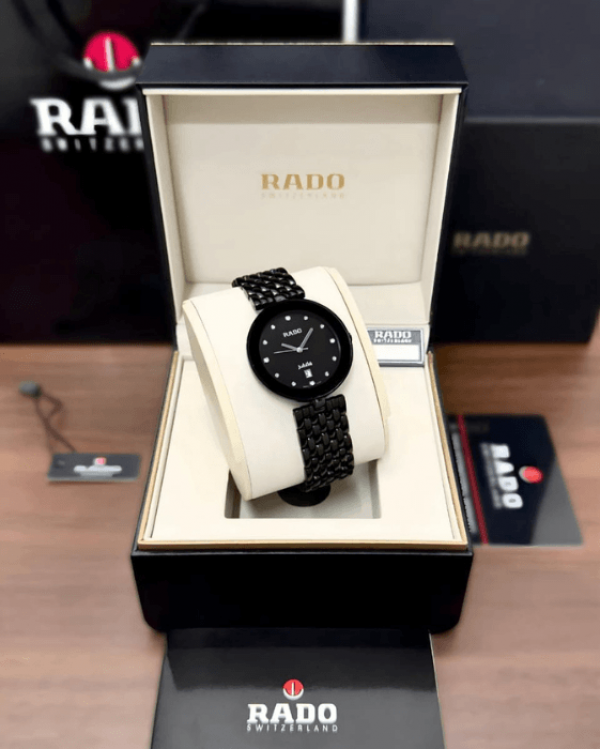 Brand - Rado - Model - Florence - For - Her - Quality - 7AA Ultra- Premium Collection - Dial Size - 34mm - Warranty - 1 Year Machine Warranty - Date Counter - Stainless Steel Body - IGP Colour coating with no fading and rusting - 100% quality & reliable quartz 3 hand machine - Stainless Steel Black Body - Smart Fit adjustable black metal strap - Packed in Rado Premium Hard Case leather brand name box! - No colour fading and rusting - SMA-FS1899-985328